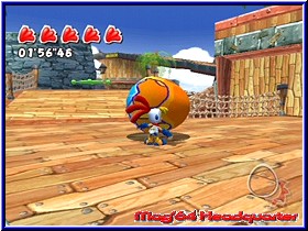 Grundlage des Spiels sind 7 Locations, die man im Verlauf besucht. Dargestellt über eine Levelkarte findet der Spieler ebenso eine Abteilung Galerie und wenn man eines der versteckten GBA Games gefunden hat den Menupunkt dafür. Anfänglich ist nur die erste Welt begehbar, die alle in verschiedene Missionen eingeteilt sind. Nacheinander lösbar dürft Ihr diese wenn Ihr wollt jederzeit wiederholen und erneut spielen. Wie bei vielen Games gibt es auch hier bei jeder Mission eine Bewertung die man natürlich verbessern möchte. Doch bis dahin steht euch erstmal das Gameplay bevor und Ihr startet in die erste Mission und bekommt nun auch ein bißchen was zur Story gezeigt. Hier beginnt schon das erste Umdenken. Wir befinden uns im Land des Morgens, das von Hühnern bewohnt wird. Ein friedlicher Ort ohne Sorgen und mit viel Sonnenschein. Eines Tages jedoch fallen schwarze Krähen in das Land ein und hüllen es in Dunkelheit. Noch schlimmer ist für die Hühner die Tatsache das Ihr 6 Anführer eingesperrt sind. Denn ohne deren allmorgendlichen Weckruf geht in keinem Level mehr die Sonne auf. Hintergrund des ganzen ist das ominöse Giant Egg, das seinem Besitzer alle Wünsche erfüllen kann. Und so nimmt das ganze seinen Anfang. Nur eine kleine Gruppe cooler Kids macht sich auf den Weg um das Licht zurück zu bringen und den magischen Zauber zu brechen. Den Anfang macht dabei Billy Hatcher und das Spiel beginnt. Erste Parallelen findet man so schnell zu einem Sonic. Das beginnt schon bei der Engine und der Umsetzung der Welten. Startet Ihr ein Level, so findet Ihr euch in einer 3D Umgebung wieder die auch locker aus einem Sonic Spiel stammen könnte. Dabei ist der Beginn jeder Welt immer gleich. Ihr müßt als erstes einen der Hühner Oberhäupter befreien, damit dieser das Tageslicht in das Level zurückbringen kann. So steuert sich das Spiel zu Beginn auch erstmal wie ein Jumper im Stile eines Sonic. Ihr habt per A-Taste einen Sprung, bewegt den Charakter mit dem Stick und könnt per C-Taste die Kamera frei bewegen. Aber auch ein Thema über das es noch zu reden gilt. Soweit so gut. Problem für den guten Billy ist aber die Tatsache das er sich weder Wehren noch allein gegen Feinde bestehen kann. Und da es davon reichlich gibt muß es etwas geben mit dem man dies bewerkstelligen kann. Und schon kommt das große Thema Eier in's Spiel. Diese liegen in jeder Welt verteilt herum und existieren im gesamten Spiel in 72 Variationen. Einfachste Möglichkeit es zu nutzen ist wenn Ihr Billy zu einem bewegt und euch dahinter stellt und schiebt. Jetzt "klebt" es praktisch an seinen Fingern und Ihr benutzt das Ei um Gegner zu eliminieren. In ihrer Grundform sind alle Eier gleichgroß, unterscheiden sich aber in ihrer Farbgebung was für das Spiel äußerst wichtig sein wird. |