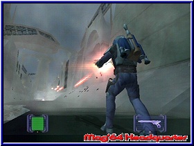 Auch wird die Continue Anzahl bei jedem neuen Rücksetzpunkt den man erreicht wieder um einen Wert aufgefrischt. Finde das gelungen und entschärft das Nicht Speichern können innerhalb des Levels. Was die Level Designs angeht gibt es Licht wie Schatten. Grob gesagt ist das Spiel schon sehr linear. Es gibt wenige Stellen wo man mal abzweigt. Probleme machen eher kleinere Rätsel oder die zahlreich vorhandenen Geschicklichkeitsaufgaben. Die Level sind ausreichend groß und bieten Spielzeiten von 20 Minuten bis zu 1 Stunde. Hier bietet das Spiel mehr als Men in Black II. Trotzdem ist die reine Spielzeit nicht ewig lang. 10-15 Stunden reichen um das Ende zu sehen, wobei mehrmals angefangene Leveln natürlich nicht mit in die Zeitstatistik einfließen, sondern nur die Zeiten in den man ein Level auch geschafft hat. Spielerisch aufgewertet wird das Spiel ab dem zweiten Kapitel. Dann bekommt Jango eine neue Ausrüstung - das JetPack. Damit ist es möglich für eine bestimmte Zeit durch die Luft zu fliegen und logischerweise höhere Ebenen zu erreichen. Neben der Lebensenergie gibt es die Anzeige wie lange man hier noch fliegen kann. Später gibt es teilweise ein Power Up, das euch zeitweise wesentlich länger und weiter fliegen läßt. Aber auch immer dann zu finden wenn man es braucht. Macht aber viel Spaß und wertet das Spiel auf. Auch weil man Gegnern besser ausweichen kann. Man kann in die Luft steigen und Gegner anvisieren und wegballern. Das macht wirklich Spaß. So besitzt das Spiel aber gerade dadurch einen äußerst hohen Anteil an Geschicklichkeitspassagen. Die Schlucht der Tusken ist mir hier noch deutlich in Erinnerung. Ewig lange Schluchten Abschnitte auf einen Vorsprung nach dem anderen und massivsten Gegner Beschuß. Es gibt reichlich Orte wo man abstürzen kann und frustriert sein Pad in die Ecke werfen könnte. Einfach drauf los und es wird schon gehen kann man gerade in diesen Abschnitten vergessen. Dazu kommt das in allen Leveln reichlich Gegner auf euch warten, die teilweise immer neu generiert werden. Auch viele verschiedene gibt es auch hier Kanonenfutter und Burschen, bei denen man sich Zeit lassen sollte. Dem entgegen sind die Zwischenkämpfe in den Kapiteln recht leicht. Zumindest braucht man hier selten mehr als 2 Anläufe um ihn oder sie zu erwischen. Spielerisch wie Men in Black II nur mit größeren Leveln und spielerisch etwas mehr Inhalten. Der Sound im Spiel ist sehr gelungen und paßt zu allen Locations. Ebenfalls die Effekte der Waffen wissen zu gefallen. Etwas nervig sind die Sprachsamples gegnerischer Wachen, die sich zu oft wiederholen und nach einer Weile eher lächerlich wirken. Hier hätte man noch ein paar mehr einbauen müssen.
