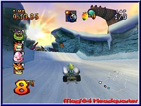 Die Extras bieten da schon wesentlich mehr zum schmökern. Neben einem Arena Editor, den freigespielten Sequenzen findet man hier nun die Link Möglichkeiten zum GBA. Kern des Spiels ist der Adventure Modus, der inhaltlich wie auf dem GBA gehalten ist. Ihr beginnt in der ersten von 4 Welten in Velo's Reich und müßt euch durch Erfolge in den Rennen erst die darauf folgenden Welten erspielen. 4 Welten warten so zunächst auf den Spieler, die neben dem reinen Fun Racer Rennen auch weitere Möglichkeiten der fahrerischen Betätigung ermöglichen. Kern sind aber zunächst die reinen Rennen. Innerhalb der 4 Welten müßt Ihr jeweils 3 Strecken und damit Rennen absolvieren. Dabei muß der Spieler unbedingt gewinnen. Danach gibt es einen Pokal, der wieder nur einen Teil der freispielbaren Dinge darstellt. Habt Ihr 3 Pokale erfahren tretet Ihr ebenfalls pro Welt gegen einen Boss Gegner in einem Rennen an und könnt erst nach dem Sieg über ihn zur nächsten Welt vorrücken. Das ganze ist so angelegt das Ihr in einer Welt in einer abgeschlossenen Umgebung wie im Rennen auch frei umherfahren könnt. Rennen, Warps und sonstige Events kann man hier anfahren oder auch nicht. Viele Spezial Rennen sind erst sehr viel später anwählbar. Angezeigt wird dies durch Symbole was man braucht um dieses Rennen fahren zu dürfen. Einzig die reinen Rennstrecken sind zunächst möglich. Crash Nitro Kart ist also auch wieder so ein Spiel das man bis zum Abspann spielen kann, dabei aber nur knapp 60% des Spiels gelöst hat. Das Savegame unterrichtet euch über den Fortschritt. Speichern könnt Ihr jederzeit in den Welten. Also gilt es fahrerisch loszulegen. Wartet wie schon erwähnt im 4. Rennen pro Welt der Boss auf euch geht es die 3 normalen Rennen vorher gegen 7 CPU Gegner zur Sache und das Gameplay ist das gleiche wie Mario Kart. Bevor Ihr loslegt entscheidet Ihr euch für einen der 3 möglichen Charaktere. Entweder Crash, Coco oder Crunch. Wobei ebenfalls das Cortex Team zur Verfügung steht. Aber wer fährt schon mit denen. ;-) Auf dem GBA einmal an den guten Crunch gewöhnt, sollte er auch hier meine Wahl sein. Unterscheiden tun sich alle 3 durch ihre Steuerung, die einfach gesagt 3 Schwierigkeitsgrade darstellen. Was auch die einzige Art dieser Wahl ist. Irgendwie verstellen könnt Ihr in Sachen Schwierigkeit nichts. Hier punktet Mario Kart mit seinen verschiedenen Cup's. Ihr seid also auf das angewiesen, was die Entwickler euch an Schwierigkeit vorsetzen. Beginnt ein Rennen wird in einem kurzen Kameraschwenk die Strecke vorgestellt. Danach wechselt die Kamera hinter euren Charakter und Ihr könnt das ganze nun aus 2 Viewpoints fahren. Was sofort auffällt sind die PAL Balken, die das Spiel besitzt. |