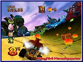 Der erste Grund warum man es schade ist das der 60Hz Modus nicht genutzt wurde. Ziel ist es nun nach Ablauf von 3 Runden als Erster über den Zielstrich zu gehen. Dies geschieht zum einen durch fahrerische Leistung, aber wie in solchen Spielen üblich auch durch den Einsatz der Items. Ähnlich wie bei Mario Kart findet man diese hier unter den Crash typischen Kisten und sammelt diese auf. Zuvor jedoch kommt das Thema Steuerung an die Reihe. Während Ihr mit der A-Taste Gas gebt und per B-Taste bremst ist das gleichzeitige drücken beider Taste mit einem extrem guten Einlenkwinkel verbunden und für enge Kurve mehr als geeignet. Per R-Taste bietet auch Crash Nitro Kart einen Drift, der sich sogar eher wie Mario Kart 64 spielt. Ihr springt und könnt nun beim Einlenken Driften. Dabei läuft auch hier eine Anzeige von Grün nach Rot u.s.w. und Ihr bekommt beim roten Bereich einen kleinen Schub, laßt Ihr in diesem Moment die Drifttaste los. Soweit so gut. Schwäche des Driften ist aber das er gerade in den extremen Kurven nicht die Wirkung hat die man braucht um ihn optimal zu nutzen. Zwar ist der Moment wenn man ihn nutzt mit einem harten Einlenken verbunden und so genau richtig. Danach allerdings wird das ganze etwas schwammig und läßt sich in Sachen Richtung wenig beeinflussen, so das man desöfteren doch an der Wand aneckt. Je nach Fahrer hat er auch die Angewohnheit beim loslassen nochmal in die entgegengesetzte Richtung auszuschlagen, was äußerst nachteilig ist, da man so nach dem Drift bald mehr zu tun hat als vorher. Deswegen ist das Fahren bei scharfen Kurven per A+B wesentlich besser und kostet wenig Speed. Per Y-Taste werden die Items unter den Kisten aktiviert und die Slot Machine Anzeige gestoppt. Die Z-Taste dient dem Rückspiegel, was oftmals eine gelungene Sache ist um zu sehen wo ein Gegner denn nun angebraust kommt. Vor allem bei Items die man nach hinten schießen kann. Hier ist der Unterschied zwischen Mario Kart und CNK geringer als in anderen Teilen des Gameplay's. Wie auf dem GBA sind diese gelungen und machen Spaß in ihrer Benutzung. Seien es zielsuchende Raketen, legbare Eiswürfel die den Gegner vereisen und damit bewegungsunfähig machen, verschiedenen TNT Kisten und Unverwundbarkeits Items, die man auch noch als Geschoss benutzen kann. Besonders gelungen ist die Bowlingkugel im Totenkopf Design. Schießt man diese nach vorn oder hinten kann man selber den Zeitpunkt bestimmen wann diese explodiert. Vor allem wenn 3 oder 4 Mann direkt vor euch auftauchen ein Heidenspaß alle durch die Gegend zu kicken. Dazu gibt es einen Wirbelwind der alle Gegner plättet und man darf feststellen das kein Item aus der Reihe fällt. Spaßig, nützlich und gut in der Benutzung ein klarer Pluspunkt des Spiels.