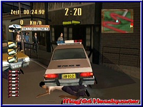 Durch die engen Gassen der Stadt könnt Ihr mit dem Powerslide gelangen der mit A und B zusammen aktiviert wird. Was die Steuerung angeht kann man nicht klagen. Der Wagen reagiert auf kleinste Aktionen mit Gas und Bremse und der Powerslide funktioniert traumhaft schön. Zwar ein typischer Arcade Drift ist das ganze sehr spektakulär zu fahren. Dazu kommen sehr schön arbeitende Stoßdämpfer und Vorderräder, deren Einsatz man auch visuell sehr schön mitbekommt. Nun ist das Spiel aber kein Rennspiel, sondern reichlich Actionbehaftet. So kommt es nicht von ungefähr, das die Wagen einiges mehr bieten. So z.b. Raketen die Ihr zur Verfügung habt. In der Stückzahl begrenzt ein kostbares Gut. Dazu das sogenannte Adrenalin Feature. Einmal ausgelöst wechselt die Grafik in Zeitlupe und ein leicht verschwommenes Bild. Damit kann man heikle Situationen besser meistern und vor allem die Raketen effektiver einsetzen. Allerdings hat auch hier das Ganze eher Tie Breaker Charakter und sollte ebenfalls wie die Raketen wohlbedacht eingesetzt werden. Was macht man aber nun mit diesen Sachen? Hauptziel in den meisten Leveln ist es der Yakuza einzuheizen in dem man deren Fahrzeuge vollständig zerstört. Das heißt es fahren in der Location Hongkong als simples Beispiel 6 Yakuza Fahrzeuge umher, die über dem Wagen eine Lebensanzeige in Form eines Balkens besitzen. Diese muß der Spieler nun mit seinem Wagen versuchen zu leeren und den Wagen damit zerstören. Das ganze wie schon angesprochen unter anderem mit den Raketen. Wesentlich effektiver ist aber das reine Rammen, Umdrehen den Gegners oder ihn in die Leitplanke drängen. Hier sitzt euch wie schon erwähnt die Zeit im Nacken, die sich in den beiden Schwierigkeitsgraden unterscheidet und teilweise auch mehr Yakuza Wagen enthält. Unterstützt werdet Ihr durch eine Karte der Location, die je weiter Ihr von den Gegnern weg seid mal heran oder auch wegzoomt. Kommen wir aber nun zu den hierauf folgenden positiven wie negativen Dingen. Was mir sehr gefällt ist die äußerst konstante Framerate, die selbst bei größter Action nicht in die Knie geht und auch vom GameSpeed her sehr gut gelungen ist. Was aber gleich einen der Negativpunkte mit sich bringt. Die Straßen der Stadt bieten einen reichhaltigen Verkehr. Was technisch sicherlich ein besonderes Lob verdient macht sich beim Spielen manchmal richtig nervig. Ihr könnt einbiegen wo Ihr wollt. Teilweise aneinander gereiht fahren hier normale Fahrzeuge die Ihr in reichlich Unfälle verwickelt. Da es kaum ein Schadensmodell gibt und getroffen Fahrzeuge nur ganz selten verschwinden landet Ihr oft im zeitraubenden Chaos und hektisches Vor- und Zurücksetzen ist die Folge.